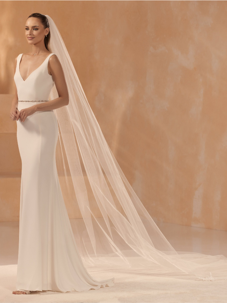 Ce voile élégant de Bianco Evento complétera votre look de mariée. Ce voile à une couche est fait de tulle diamanté avec un bord coupé en haut et un bord en dentelle en bas. Un peigne est attaché au voile, ce qui facilite la mise en place du voile dans les cheveux. La longueur du voile est de 350 cm.
