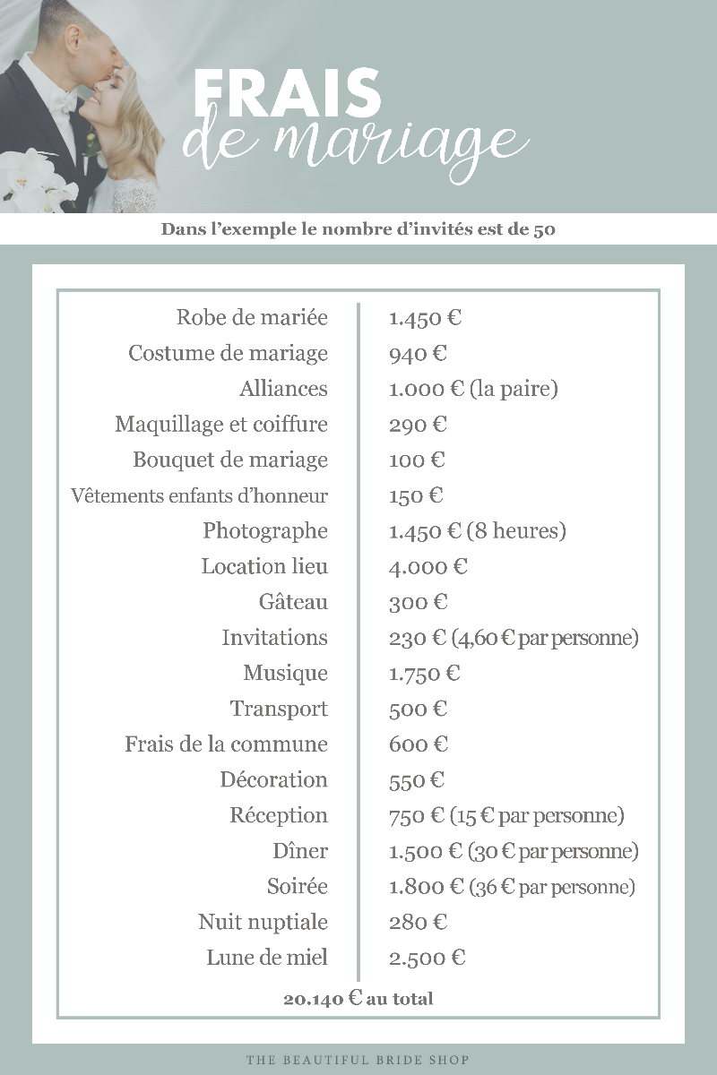 Il arrive parfois que les couples qui se marient pour la première fois se voient payer des prix beaucoup trop élevés. En outre, il y a de nombreuses choses auxquelles il faut penser et dont il faut discuter. Par exemple, qui paie le mariage, vous et votre partenaire, vos parents (beaux-parents) ou partagez-vous plutôt les frais ? Il existe également la possibilité de contracter un prêt personnel, mais nous ne l'aborderons pas ici en détail. Il est utile d'avoir une idée du prix moyen par poste. C'est pourquoi nous avons établi un tableau indiquant les coûts moyens par poste de dépenses.