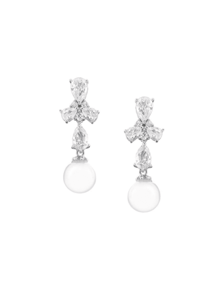 Ces jolies boucles d'oreilles en argent sont composées d'un superbe arrangement de pierres de zircon cubique étincelantes. Les perles ivoires sur les boucles d'oreilles les rendent très modernes et chics. Ces boucles d'oreilles s'harmoniseront parfaitement avec votre robe de mariée. Les boucles d'oreilles plaquées rhodium éblouiront votre journée spéciale et donneront la touche finale à votre tenue de mariage. Les boucles d'oreilles ont une longueur de 4,8 cm.