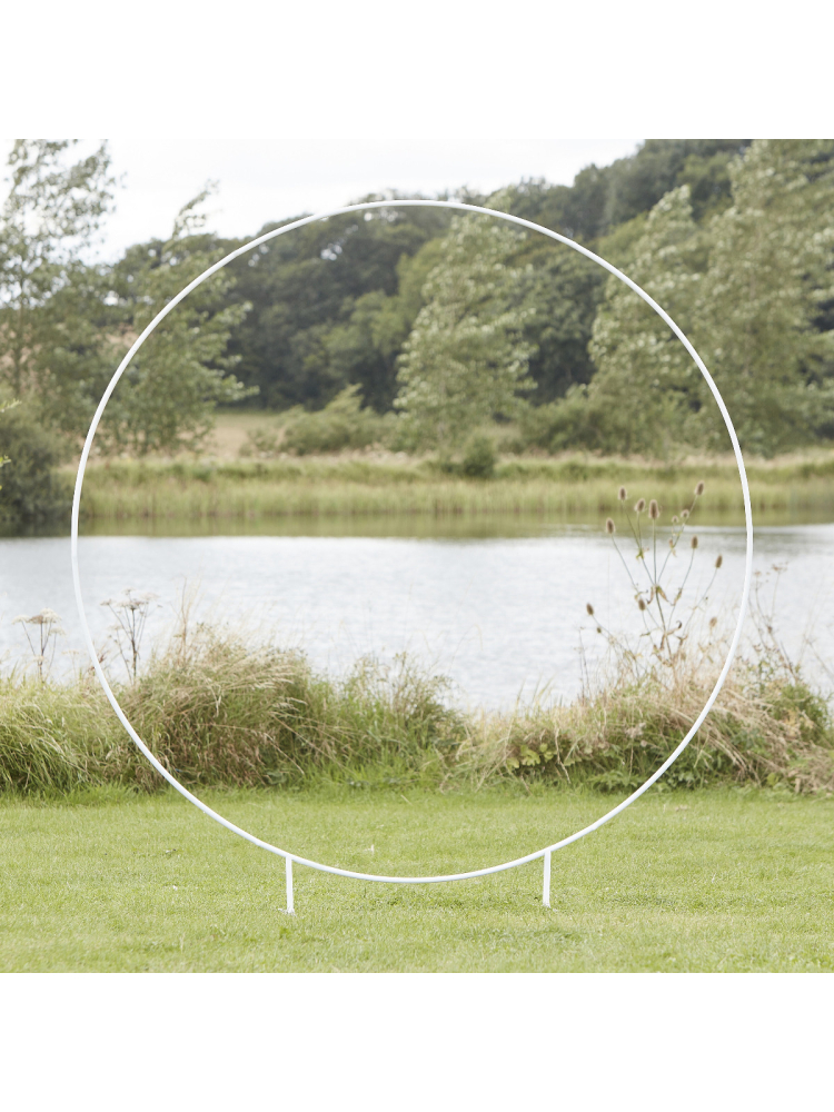 Cette arche de mariage ronde blanche est la toile de fond parfaite à afficher lors de votre cérémonie ou à utiliser comme toile de fond décorative pour votre mariage.